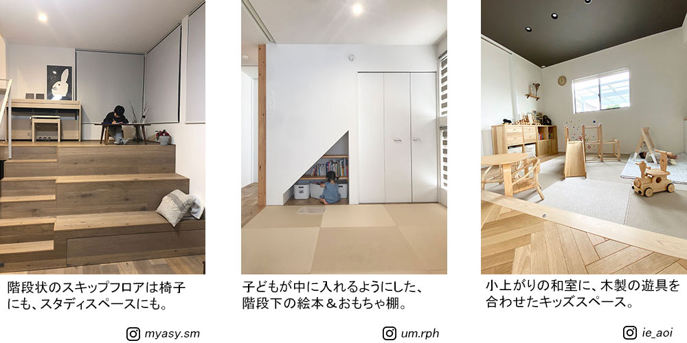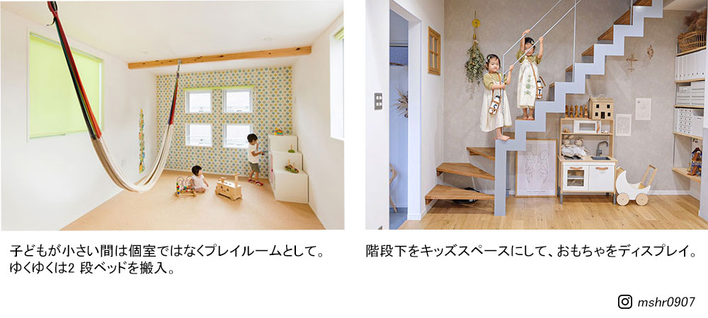 「子どもは、次の日も同じおもちゃで遊びたかったりします。そうすると、出しっぱなしになり、親にとっては、ストレスになりがちです。そこで、例えば、リビングの上のロフトを遊び場にすると、散らかっていても親からは直接見えないので、意外と許容できるんです。死角がない場合は、家具を活用するのもアイデアです。背の低いボックス家具で、部屋を仕切ってもいいですね。」