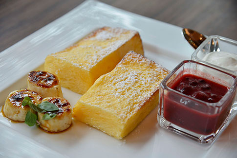 「フレンチトースト」にも、もちろん「CENTRE THE BAKERY」による、小麦の香りが豊かな食パンを使っています。卵液はあえて中心まで染み込ませていないので、軽やかな食後感。また傍らには一般的なシロップではなく、キャラメリゼしたバナナや、ホイップクリームとベリーソースが添えられているのも、さすがは世界のゲストをお招きするホテルのホスピタリティと感心させられます。