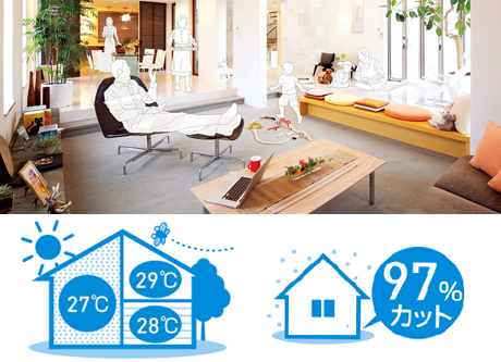 三菱地所ホームのエアロテックは全館空調でありながら部屋ごとに温度の調整が可能。だから暑がりのお父さん、寒がりのお母さん、高齢者や赤ちゃんまで、家族みんなが快適な温度で過ごせるのです。また、室温の調整と同時に換気も行っているため、花粉の季節や窓を開けられない時でもクリーンな空気環境を叶えてくれます。