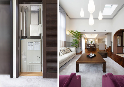 そう、とても大きな機械が家の中に設置されるような気がしますよね。でも、実はそんなことはないのです。驚くなかれ、心臓部は階段下など半畳分のスペースに収まるコンパクトさ。この室内機から家中にクリーンで快適な空気が送られます。それぞれの部屋には小さな室内機とルームコントローラーがあるだけ。ですので、壁に大きなエアコンの出っ張りができることなくすっきりとしたインテリア空間を楽しめます。しかも、風が直接体にあたるという、エアコンによくある不快さも解消されます。