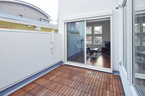 バルコニーの場所が決まり、次に課題となったのは採光性とプライバシーの確保です。ご夫婦が心配されていたのは、隣接する賃貸住宅からの視線でした。「アパートの玄関側通路が我が家の方を向いているんです。一番目線が合いやすいバルコニーの塀の高さは、最後の最後まで悩みました。10cm単位で検討しながら、頭の上が少し見えるギリギリの高さに決定。これ以上高いと閉塞感が出てしまうんです」とご主人様。その甲斐あって、プライバシーはもちろん、十分な明るさも確保できました。