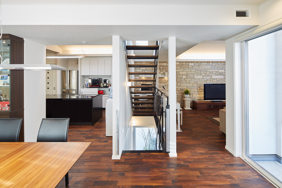 リビング、ダイニング、そしてキッチンが階段を中心にぐるりと囲む回遊式の間取りで、ドアや間仕切りなどで区切らないオープンフロアとなっています。北側に位置するキッチンや階段の踊り場にはトップライトを設け、フロア全体に陽の光がたっぷり降り注ぐ工夫がされています。