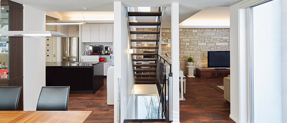 ひときわ印象的なのは正面に見える中庭のピクチャーウィンドウ。キャンバスのような白い塀に、シンボルツリーのイロハモミジが美しく映し出されます。また、アイアンと木を組み合わせたスケルトン階段が視界の抜けた広々と開放的なエントランス空間を演出します。