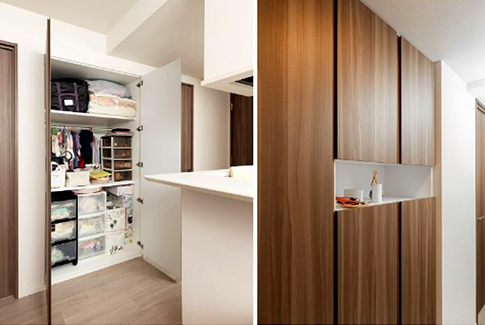 アイズプラス(当社独自開発の設備)の収納は、和室の押入のように奥行きがあり布団も収まります。真ん中の中板をオプションで追加して、上中下と用途を分けて、かなりの容量を収めています。