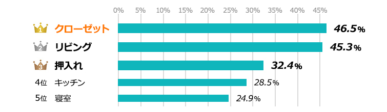 「整理整頓できていない」と感じる場所、1位はクローゼット、2位はリビング!
