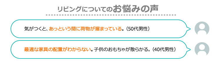 - 物の置場所を決めて、家族全員が片づければきれいになる。テーブルの上に物を置かない。(50代男性)