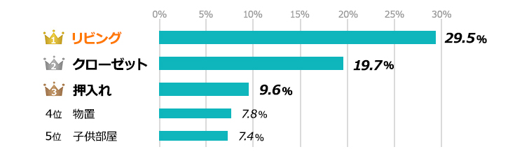 圧倒的に多かったのが1位「リビング」(29.5%)という結果になりました。リビングが散らかってしまう理由としては、「書類や雑誌、日用品、リモコン類などが出しっぱなしになる」、「最適な家具の配置がわからない」、「子供のおもちゃが散らかる」などのご意見がありました。リビングは使用頻度も高く、家族で共有するスペースのため、放っておくと散らかりがちというご家庭が多いようです。