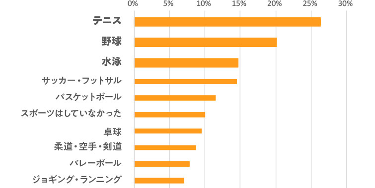 3位の水泳を除き、球技系スポーツが上位を占める結果となりました。TOP10の顔ぶれを見ると、部活動やサークルなど団体に所属して行うスポーツが多い印象ですね。一方で、「スポーツはしていなかった」という方も10%ほどいらっしゃいました。