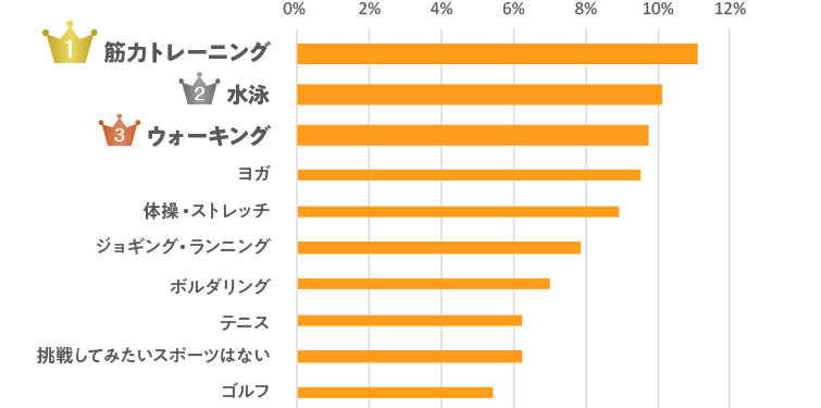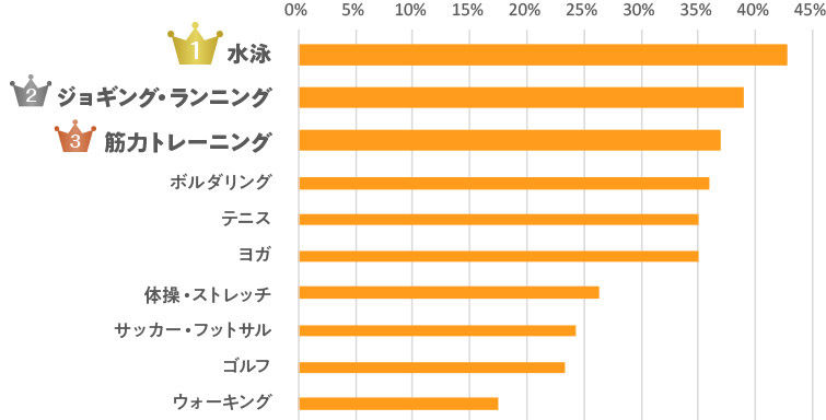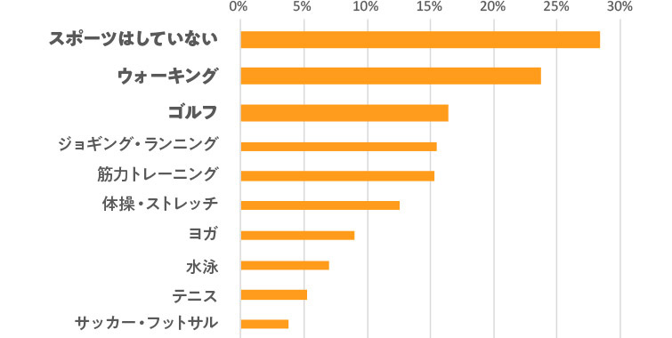 学生時代やっていたスポーツとは大きく顔ぶれが変わり、上位を球技以外が占める結果に。ゴルフ以外は、ウォーキング、ジョギング・ランニングなど初期投資があまり必要なく、手軽に始められるスポーツに票が集まりました。