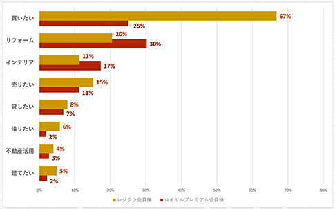 「リフォーム、インテリア」の合計が、5割近いロイヤル・プレミアム会員様は、現在のお住まいをより良い方向に改善したいという意向。中でも、キッチン、バス、洗面、トイレなど水廻りのリフォームが一番の関心事です。「売りたい」は、11%と高くはない数字なので、いまのお住まいに満足感を得て、住み続けたいと考えているのではないでしょうか。