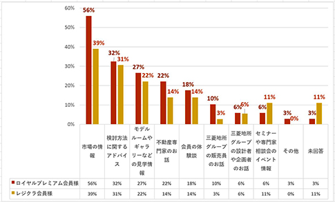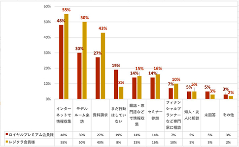 注目したいのは、セミナー参加、フィナンシャルプランナーなど専門家に相談、知人・友人に相談の3項目。住まいに関する相談の内容は個別性が高いものなので、どちらの会員様も対面で直接話を聞いてみたいと考える傾向にあるといえるでしょう。
