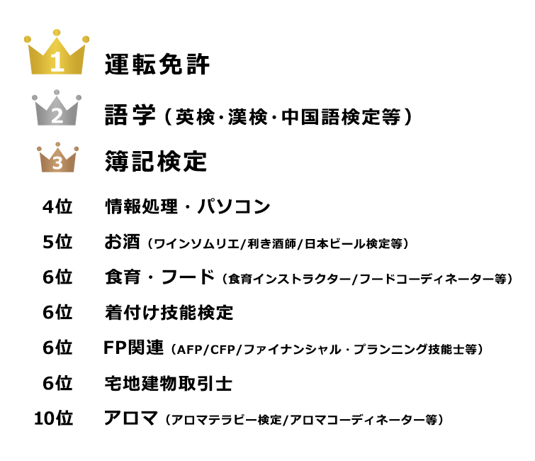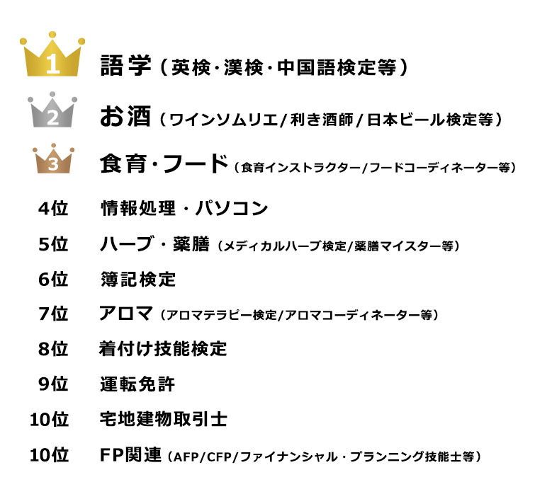1位の運転免許は、やはりと思える結果になりました。次いで語学や簿記検定など、有名な資格が並んでいます。4位からは、お酒や食育、着付けに宅地建物取引士など、衣食住にまつわる資格が多く見られます。お金の知識が身に付くFP関連の資格も、取得できれば自分で資産運用などができ、心強そうです。