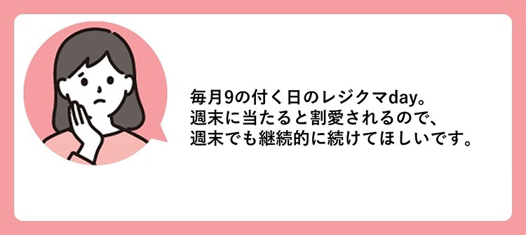 9の付く日のレジクマdayが土日祝日に当たる場合、メルマガでのご案内はしておりませんが、レジクマday自体は曜日に関係なく開催しています!