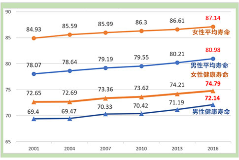 - 資料:平均寿命:平成13・16・19・25・28年は、厚生労働省「簡易生命表」、平成22年は「完全生命表」、健康寿命:平成13・16・19・22年は、厚生労働科学研究費補助金「健康寿命における将来予測と生活習慣病対策の費用対効果に関する研究」、平成25・28年は「第11回健康日本21(第二次)推進専門委員会資料」