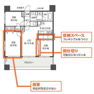 まず、隣り合う居室同士の仕切りが、ウォールドアやスライディングウオールなど、可動間仕切りになっているものが挙げられます。例えば、リビング・ダイニング(LD)との間仕切りを外して、広めのLDを設けることが可能です。将来子どもが独立して、3LDKを2LDKにするような場合に、リフォームの必要なく簡単に実施できるのが長所です。