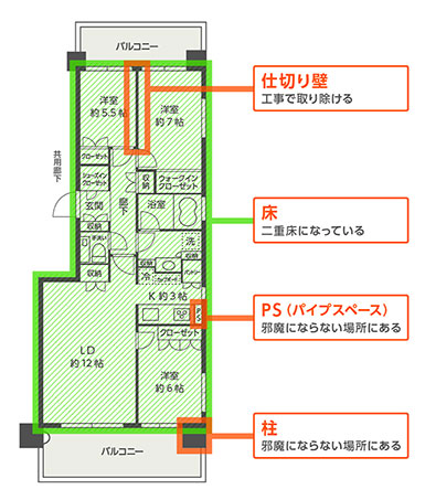 まず、隣り合う居室同士の仕切り壁が、工事で取り除けるかどうか。取り除くと大空間を設けられ、家族の増減に合わせた間取りの変更が可能です。ただし、マンションによっては、壁が柱の代わりをする壁式構造となっていることもあるため、注意が必要です。壁式構造は、耐震性に優れているというメリットはありますが、壁を取り除くことはできないため、リフォーム時に制約があります。