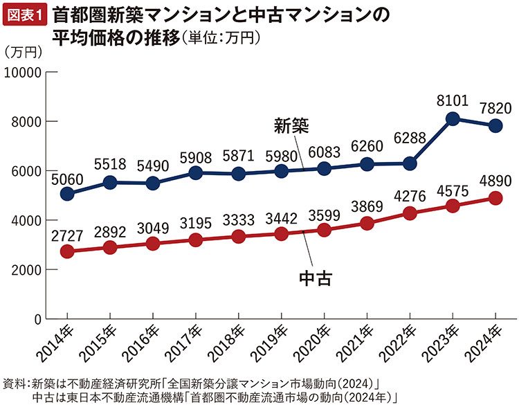 図表1は、民間調査機関の不動産経済研究所による首都圏新築マンションの平均価格と、東日本不動産流通機構(東日本レインズ)による首都圏中古マンションの成約価格の推移を折れ線グラフにまとめたものです。2024年の新築の平均は7,820万円で、2023年の8,101万円から前年比3.5%の下落となっています。
