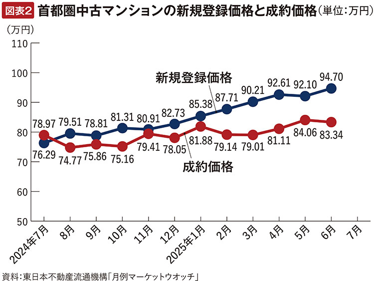 その影響か、中古マンションの売り出し価格と成約価格の差がじわじわと広がっています。東日本レインズによると、図表2に示されているように、2024年7月には中古マンションの売り出し価格である新規登録価格の1㎡単価が76.29万円、実際に契約が成立した成約価格の平均は78.97万円でした。同一物件での比較ではないため単純には比べにくいのですが、売り出し価格とほぼ同水準で成約している物件が多いことがうかがえます。