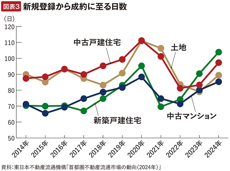 その結果として、新規登録から成約に至るまでの日数が長期化しています。図表3にあるように、2020年から2022年にかけては成約までにかかる日数が短縮しました。住宅価格の高騰による“ミニバブル”で、売り出せばすぐに買い手がつき、交渉期間も短く済んでいたのです。