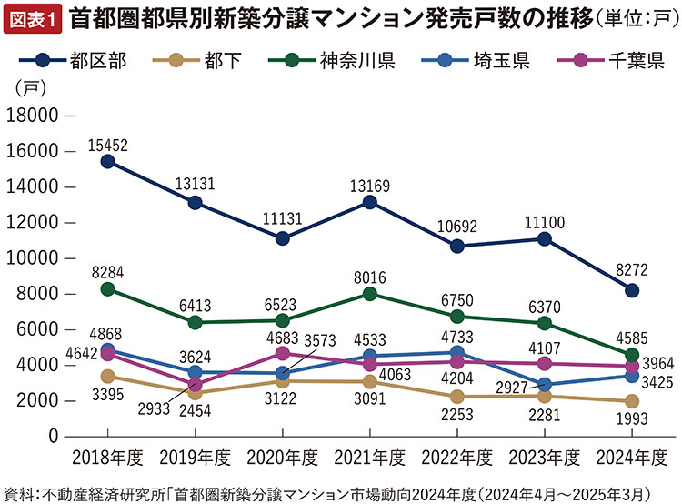不動産経済研究所の調査によると、図表1の通り首都圏の新築マンション発売戸数は右肩下がりで、特に都区部の減少幅が大きくなっています。2018年度には1万5,452戸だったのが、2024年度は8,272戸と約半分に減少しています。都下や周辺3県も減少していますが、都区部ほどではありません。
