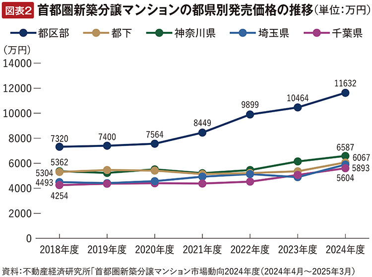 不動産経済研究所の調査では、首都圏の新築マンション発売価格は図表2の通りです。都区部の平均価格は2018年度の7,320万円から2024年度には1億1,632万円と、6年間で約6割上昇しています。都下や周辺3県も緩やかな上昇曲線を描いています。