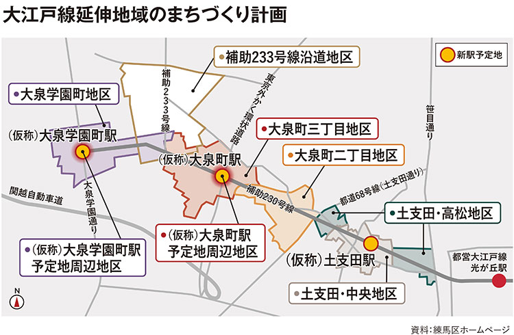 練馬区では、延伸によって開設される新駅周辺の開発計画の作成に入っています。たとえば大泉学園町駅では、利便性の高い駅前広場を確保し、店舗やサービス施設が立地する賑わいのある新たな拠点地区の形成を想定しています。また、大泉学園通りの商業地区は、桜をシンボルとした緑豊かな街並みの中に、店舗やサービス施設などが連続して立地する、活気ある快適な商店街を形成するとしています。