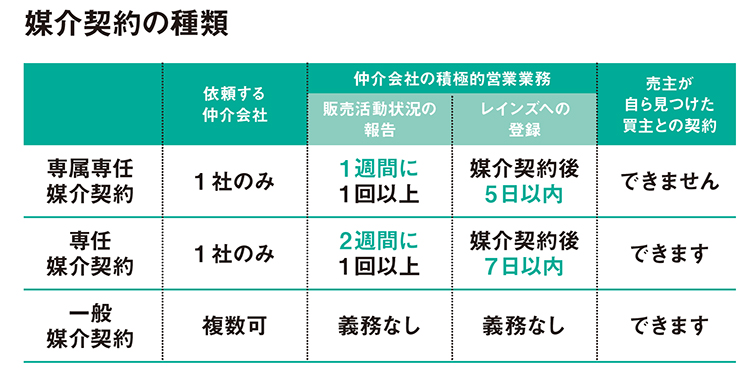 売却活動を始めるにあたり、媒介契約の締結が必要となります。媒介契約には「専任媒介契約」「専属専任媒介契約」「一般媒介契約」の3種類があります。この中からご希望に合った一つをお選びいただきます。