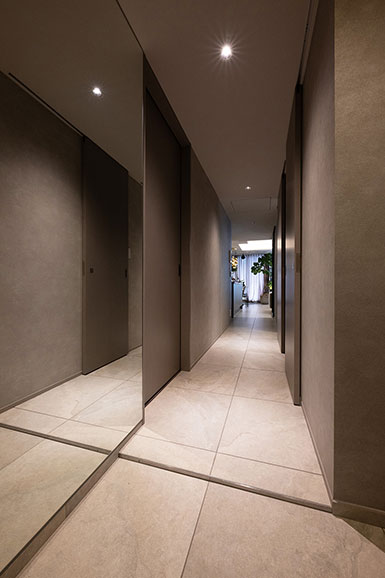 「ダウンライトを使用する場合も、光源が直接目に入らないグレアレス仕様を選び、眩しさを抑えます。玄関では土間と廊下を同じ素材で仕上げて段差を最小限に抑えるなど、生活感を感じさせない設計を徹底しています」