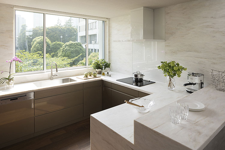 人工大理石(人造大理石)なら天然石のような高級感がありながら、耐久性が高くお手入れも簡単。カラーバリエーションも豊富で、理想のキッチン空間を演出できます。最近人気が上がっているのがセラミック。焼き物なので高温に強く、木目デザインなどもあります。他にメラミンなどもありますので、好みに合わせて選びましょう。