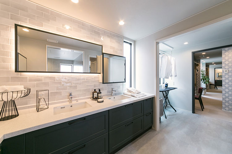 既製品ではなく、造作のカウンターに洗面ボウルを設置するスタイル。オリジナリティが高く、収納の形状も自由自在。生活スタイルや好みのデザインにぴったり合わせた、わが家ならではの洗面台が作れます。