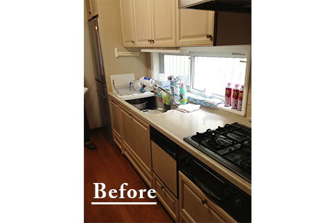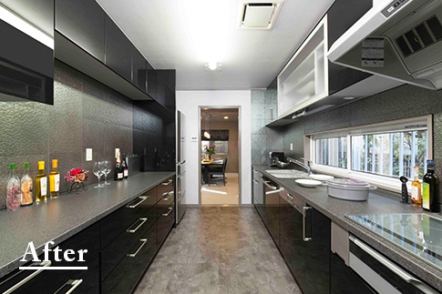 食器棚を吊戸棚にしたことで、スペースが生まれ、広々とした開放感を実現。キッチンの扉やカウンターの面材、床のフロアタイルは、リビング・ダイニングと合わせて、シックで落ち着きのあるカラーを採用したことで、お部屋全体が統一感のある空間に仕上がりました。