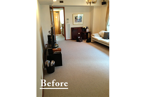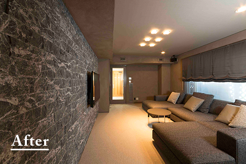 グレーの珪藻土で仕上げた壁は一面を天然大理石に。アクセントウォールがより高級感を演出します。ソファやカーテンもグレーを基調にコーディネートすることで、ゆったりとくつろげる空間に生まれ変わりました。