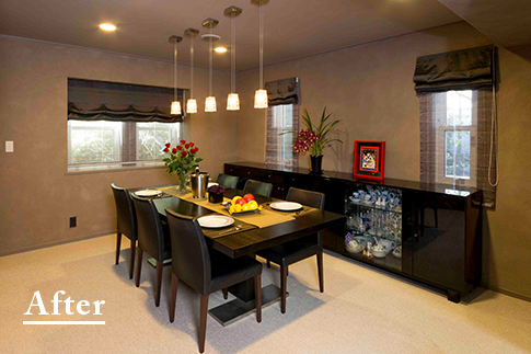 やわらかな電球色の間接照明と食卓を照らす美しいペンダントライトで、シックでありながらも温かみのあるダイニングに。