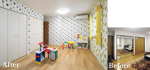 S様 「私にとっては幼稚園の頃から住み慣れた思い出のある実家でまた暮らせるのはうれしいです。とくにお気に入りは子供部屋。フクロウ柄の壁紙はメーカーのショールームに行って一目見て気に入ったものなんです。職人さんにはフクロウ柄を壁に貼るのは初めてだよって驚かれましたけど(笑)」