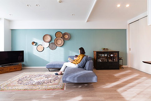 広々としたリビングでお気に入りのインテリアに囲まれ、ゆったりとくつろいでいらっしゃるU様のお姿を拝見し、今回のリフォームでお力になれたことを大変うれしく思います。
