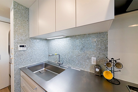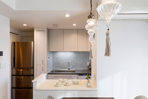 U様 グレーにゴールドが混ざったような色のタイルが気に入っています。インテリアは、友人でもあるプロのインテリアデザイナーにセレクトしてもらい、三菱地所のリフォームとコラボレーションすることで、ステキな空間に仕上がりました。また、キッチンはTOTOのものを選びました。右奥の白いカップボードは三菱地所グループのオリジナルのものをつけていただきました。もともとカウンターの側面に壁があったのですが、それを取り払い、キッチンとリビングの連続性を持たせて広々と見せることにしました。もともとあった収納の扉を生かした部分もあります。把手は既存のものを使い、扉にダイノックというシートを貼っています。
