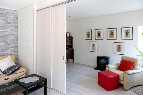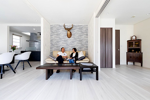K様 以前は1階に寝室がありませんでした。将来的に1階と2階を階段で行き来する生活が大変になるかもしれません。ですので、今のうちに1階だけで生活ができる準備を整えておきたいと考えるようになりました。リビングを引き戸で間仕切りすれば、寝室ができるシカケを作りました。