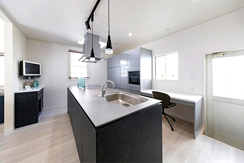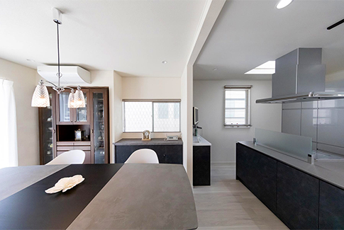 ━━アイランドキッチンの深みのあるグレーが素敵です。