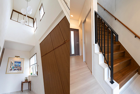 今回、2階はリフォームしませんでしたが、2階に上がる階段の壁を撤去し、抜け感のあるアイアンの手摺りに変更しました。このリフォームで玄関ホールに広がりが生まれました。