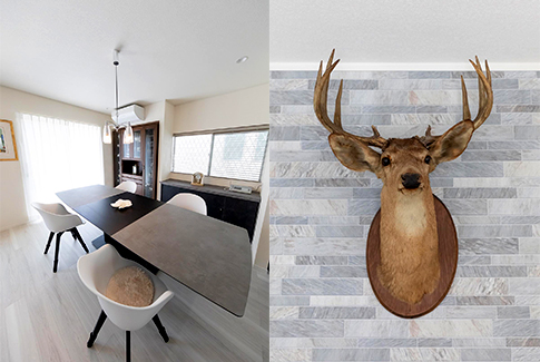 以前から持っていたアンティークの家具をいくつか合わせていますが、モダンな空間にしっくりと収まっています。リビングにある鹿の剥製は、NYのアンティークショップで買った1880年前後のものです。