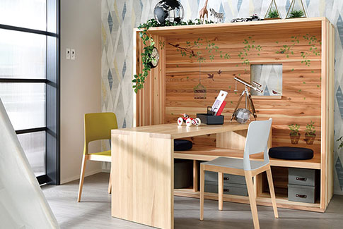 プランαの可動式テーブルは、向き合う人がコミュニケーションしやすい距離(45~75cm)が計算されています。例えば、リビングにダイニングテーブルとは別に配置。奥様専用の趣味や家事作業のスペースとして必要な材料なども収納すると、料理やフラワーアレンジメントなどパーソナルな教室を開いて人を集う場所にもできるでしょう。