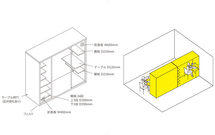 プランβは、豊富な収納力を持ちながら、中に人が入って机に向かえる個室感覚の小部屋です。例えば、空いたままの子ども部屋にふたつの『箱の間』を設置。趣味の道具を飾ったり工房のように作業したり、写真やアート、語学や文学など学びの場しても。すべてこの箱にお気に入りアイテムとして集めれば、夫婦それぞれの自分空間として演出できます。