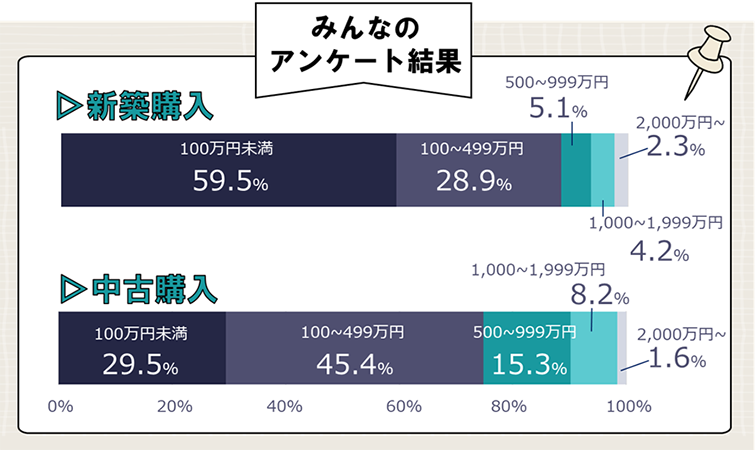 1回目のリフォームにかける費用は、「新築購入者=100万円未満(59.5%)」「中古購入者=100~499万円(45.4%)」が多いことが分かりました(図3)。