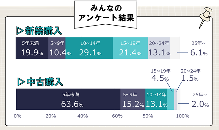 最もリフォームが集中した時期は「新築購入者=入居後10~14年目(29.1%)」「中古購入者=入居後5年未満(63.6%)」でした(図1)。