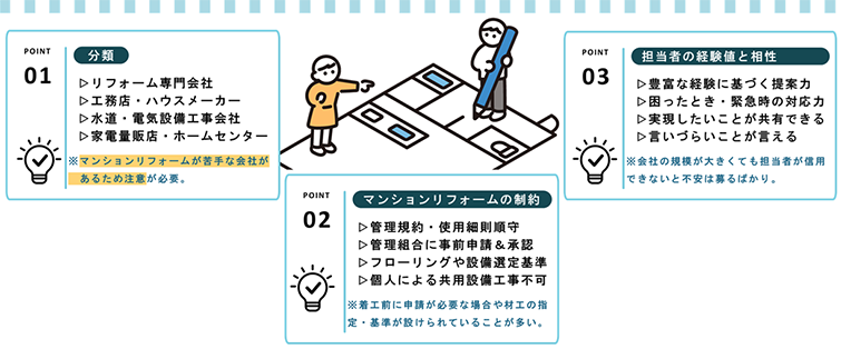 ポイントは次の3つです。特に1つめのポイントに挙げていますが、リフォーム会社の得意分野を見極めることは大変難しく、盲点になりがち。リフォーム会社選びで困った時は、管理会社に相談してみるのも一つの手です!