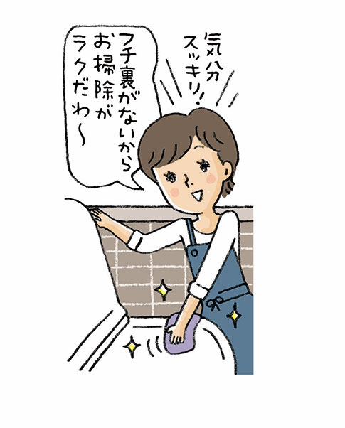 たしかに、便器のフチ裏や便座の裏には汚れがたまりがちだ。でも、最近のトイレは、便器のフチ裏がないものが主流で、フチを軽く握るようにしてサッとひと拭きするだけでOK。便座の裏も継ぎ目がなく、拭きやすい。これだけでお掃除の手間がグンと省けてしまう。