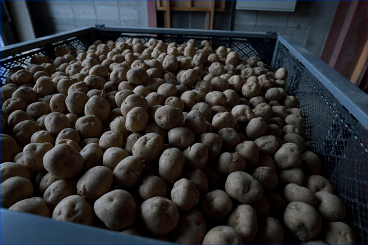本間さん うちでは収穫したじゃがいもを冷たくて暗い環境において約540日間寝かせるのですが、簡単にいうと土の中でじゃがいもが「冬眠」しているような状態を作っています。冬眠中は光合成によって生成されたデンプンを、どんどん糖に変えて蓄えていくんです。だから寝かせる期間が2年近くなれば、それだけ甘みがじゃがいもの中で増しているのです。その代わり、冷たくて暗い環境から出した瞬間にじゃがいもが目覚めてしまう。すると、一気に質感が変わってしまう。とてもボソボソしていて、美味しくないものになりますね。だから管理が難しく、信頼しているレストランにしか「五四〇」は販売しないことにしています。