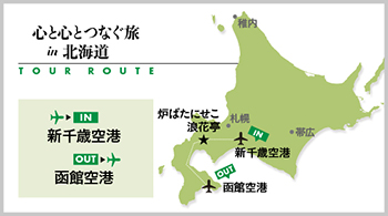 新千歳空港から車で2時間。ニセコ方面へ向かい、倶知安町の「炉ばたにせこ浪花亭」で「五四〇」料理を堪能する。その後ニセコ町内に宿泊し、翌日は函館空港を目指す。