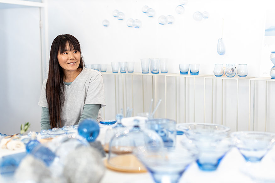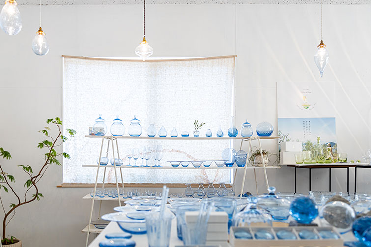 ——Aji Glassの青のやわらかい輝きは、見る人の心を癒す力があると感じました。本日取材をさせていただいているこのアトリエは、たくさんのAji Glassに囲まれていて、神聖な感じがします。