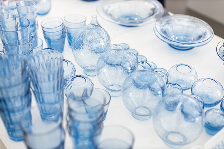 杉山さん 嬉しいです。アトリエに入った瞬間、皆さん「うわー!」と感嘆の声を上げてくれます。それだけで、あぁ良かったって思います。「ずっといられる、この場所」とか「浄化される」と言われると報われた気持ちになります。やっぱり、天然のもので作られた色の力が、一番人を惹きつけると思うんです。人工的に染めた布よりも、やっぱり草木染めの方が優しげで気持ちが和らぐじゃないですか。ガラスにも同じことが言えると思っています。この青も、単純な「青」ではなくて、化学反応によって色んな色がブレンドされて表現された色。それは何千年も眠っていた庵治の土地の地層が生んでくれた色で自然の恵みから生まれたものです。だからこそ、これほどまでに透明感があって、人の心をつかむ色味になるんですね。